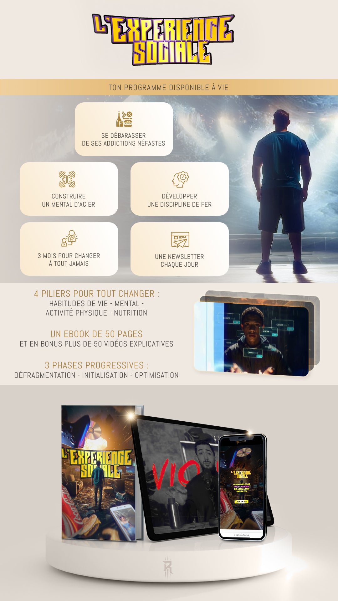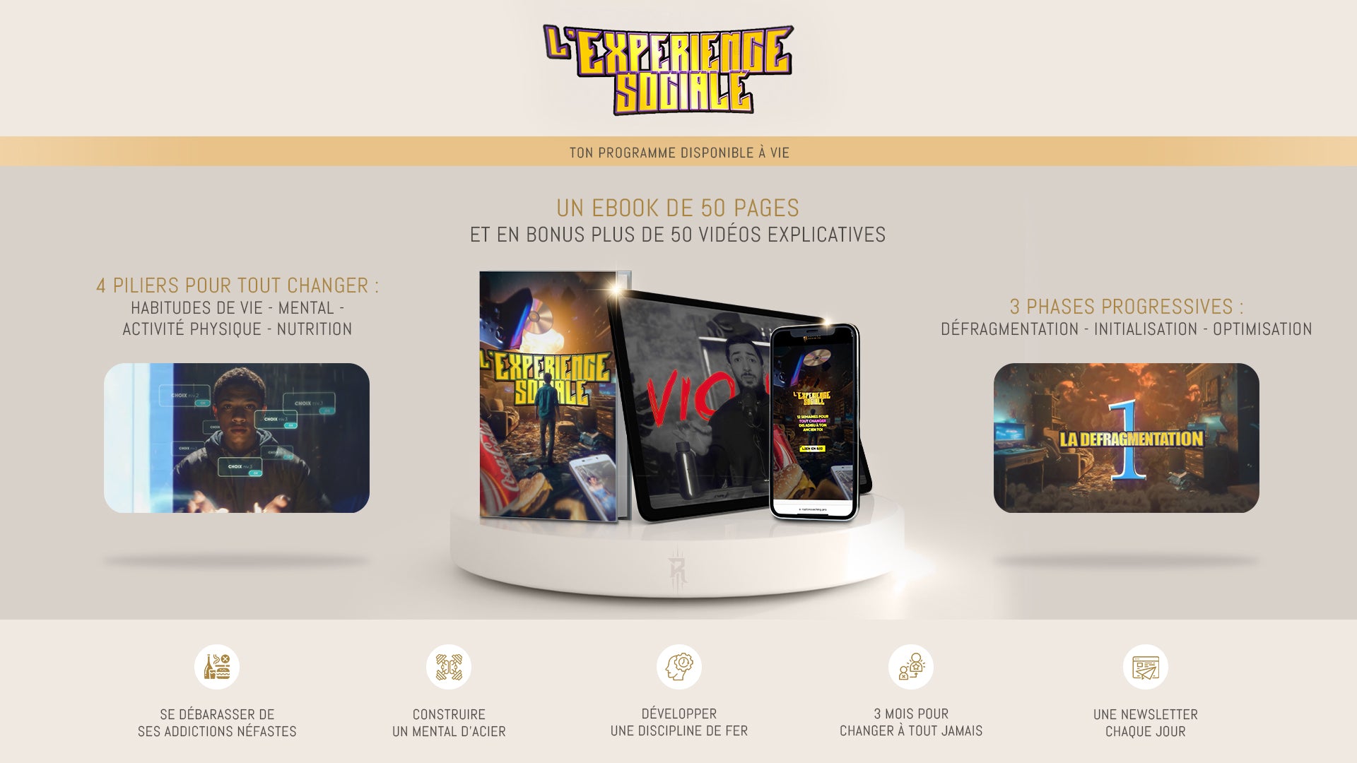 L'Expérience Sociale, c'est un plan pour réussir ta transformation de vie et t'aider à créer notamment une discipline qui te servira dans ton programme sportif/nutritionnel actuel mais également dans tous les domaines de la vie.