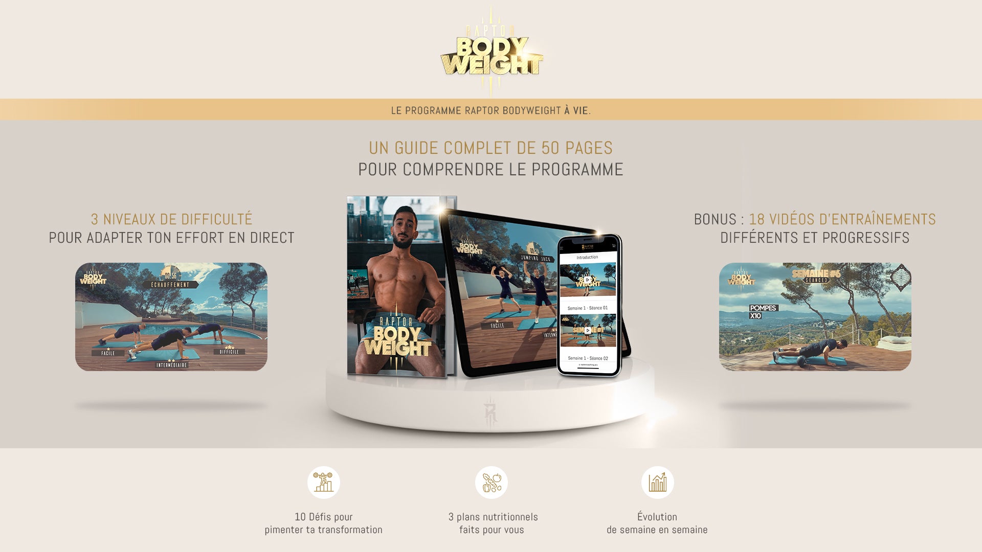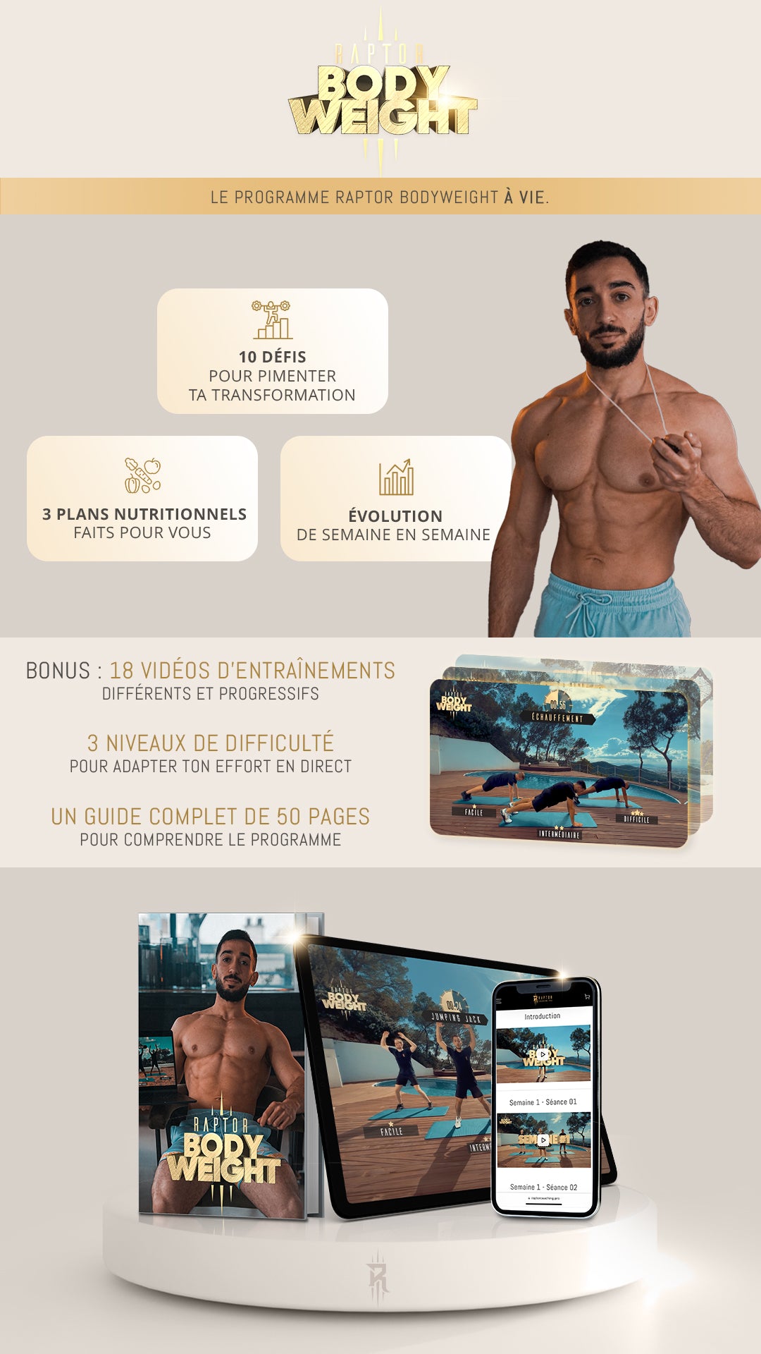 Retrouve tout ton programme Raptor Bodyweight dans un e-book synthétique et en bonus le Raptor et son équipe dans 20 vidéos d’entraînements simultanées entièrement guidées dans un cadre magnifique et motivant.